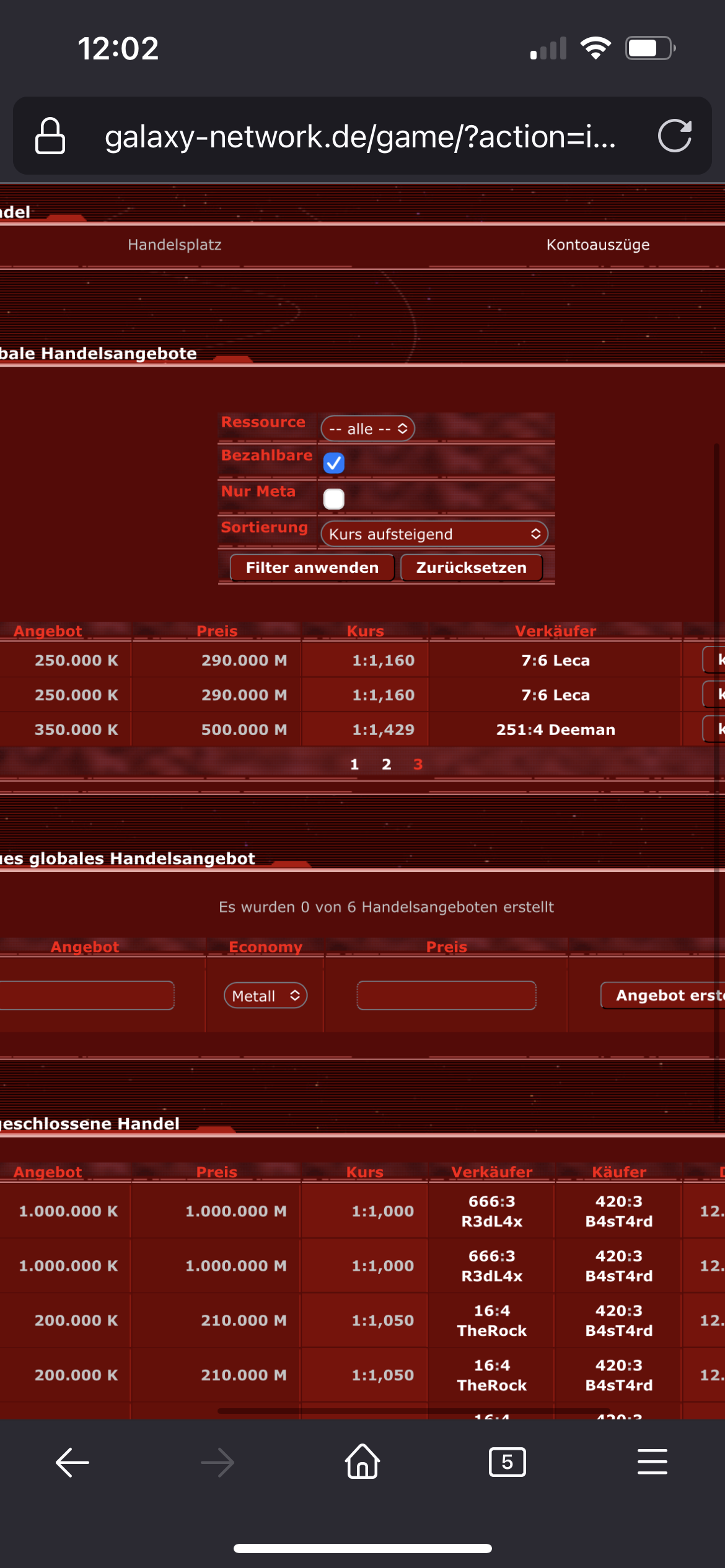 Im Spiel unter Handel kann man die Angebote nicht zwischen Metall und Kristall filtern!